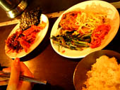 | あとで知ったんですが、 ここはキムチ・海苔、ナムルなどをゴハンと頂く 韓国の一般食事、 いわゆる「韓定食」の屋台だったみたいです。 ガイドブックに載ってる韓定食屋なんて 3000円〜とかばっかだったので (まぁ種類が圧倒的に違いますが....) まさか300円!でこんだけの種類 食えるとは 超驚き!でした。 |