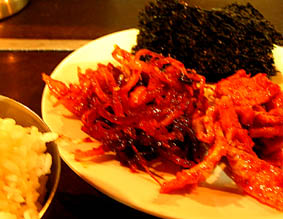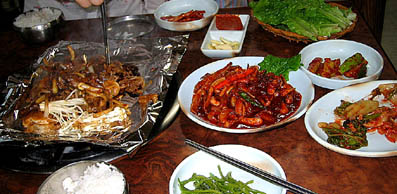 | ハングル文字が全くわからんので つたない韓国語でオススメを頼む。 どうやらここは プルコギ専門店らしい。 頼んでから数分で 牛肉&タコのプルコギが山盛りにて 堂々と登場。 後で知ったのですが、 地元のこれらの店 ほとんどが 一品勝負らしいです。 あとどんな料理にも必ず 山盛りキムチライスセットが 付いてきます。 |