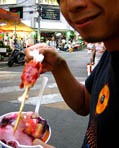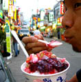 | 今回の旅、最大の目的である 本場の焼き肉を堪能!(東大門にて)の前に ホテル近くの商店街をブラりしてみる。 まずは やけーに盛りだくさんな かき氷を2000Wで購入。 懐かしい味の餅がいっぱいのっててノスタルうめえ。 追加でこちらの名物であるチキンの甘辛串焼きも 1000Wで。 コレ すんげーーーーーーーうめえ! |