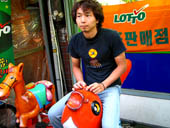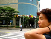 | も、さすがに30分では街をウロツキまわることもできず 恒例の旅のはじまり コンビニ・ファーストコンタクトに挑戦! 事前に用意していたカムサハムニダ(こんにちは) という韓国ワードをシャウトしつつ入店すると BoAちゃん似のかわいこちゃんが優しくリフレインしてくれる。 ナイス。 とりあえず韓国お茶100円と韓国海苔巻き120円を購入し、貪る。 うーむ 日本のテイストに限りなく近い。うまし! などなどやってると出発の時間になったので、あわてて ファッキンルイスヴィトン前へと戻る。 |