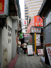 | さてさて、ちょい食いちょい食いで 微妙にお腹イパーイになってしまったカメ氏。 でありながらも、 やっぱ本場のヤキニクでしょう!とばかりに 残ったウォン紙幣を握りしめ ぷっくりとふくれた胃をかかえながら 東大門駅へと向かいます。 |