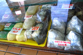 ぐっはー! 青グロい魚やヘンテコ惣菜など 期待通りのヴィジュアルです! とにかく得体の知れない食い物満載! んなわけで、 チョイ食いチョイ食いしながら 一個一個チャレンジ開始ーーーー! やっべーーー 楽しい! ▲朝市ムービー |