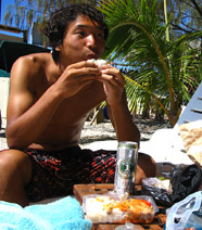 割高ながらキンキンに冷えたビールを カナール島売店で購入し、 本島スーパーで買ってきた 格安弁当とともに.... 華麗に南国かっこみ食い! ・・・・・・・・・・・・・・ 天国に一番近い(ほっぺが) ひとときを堪能いたしました。 にしても.... カレドニアの飯は なんでもうまい!! |
