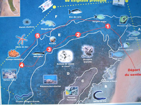 さてさて、肝心の海中はというと... 人工的ながらも それなりに守られた珊瑚礁エリアが 図のように趣向を凝らして 配置されており、なかなかオモシロそう。 ポンツーンで 世界一を見てきてしまったので まぁ あまり期待しないながらもご海入。 |