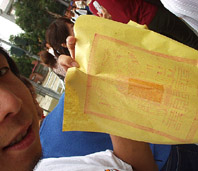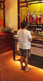 んで、ひと通りお参りした後に、台湾寺院式占い というものを教わる。 まが玉を半分に割った形の一対の木を、願いとともに放り投げ、 平らな部分とラウンドがかった部分が同時に出れば、願いが叶う というもの。 |