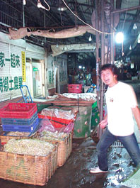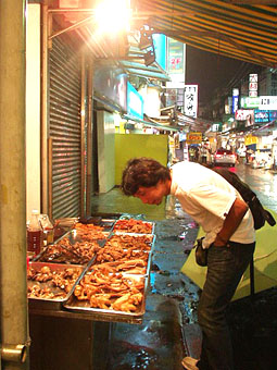 んで いよいよ夜市で有名な屋台通りに入っていくわけなんですが............. ここも台風接近の為 出店率 わずかに約2%という感じでした。 ぐっは〜 やられた! んでも その少ない出店だけでも十分楽しめるほど、ひとつひとつの店・屋台は濃ゆーい魅力に溢れていました。 左写真のお店なんかは、鳥のあらゆる部分をブツ切りし、すべて照り焼き風に調理?して売ってましたよ。 あれ!!? コレ 生肉なのかな...? で これ、このまま食うんかなぁ........?