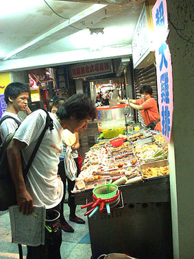 どうにかこうにか地下鉄駅を見つけだし、切符販売機へ。 50元コイン投入後、ガッチャンコ コロンコロンみたいな いかにも機械チックな音をだしながら切符が出てきました。(近代的なんだけど、なんか違う) TDLの入り口みたいな自動改札を抜けホームへ。んで、行き先を十分に確かめてから、乗車。 ..........ガタンゴトン..... プッシュー...... 苦労したワリに10分ほどで、士林に着いてしまいました。 いんや〜ちかれた。 外出ると、雨がポツリポツリ。 が、夜市や夜市〜! などと 到着した喜びでまったく気になりまへん。 さぁ 食いたおすで〜 とばかりに 最初に目に入った屋台で、小さく黄色い焼き菓子を躊躇無く 購入。 |