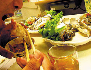 で、次ぎに いっちゃん楽しみにしてた「牡蠣鍋」やってきましたっ! うっひょ〜 コノヤロ ほとんど煮ないでオレの胃袋に放り込んでやるぜ! ...........などと意気込んでいると、でてきたのはなぜか高そうな「蟹鍋」。。 かきなべ→かになべ ......うむむ 確かに似てるが............ すかさず カメールは おい バアさん! ワザとか!? と声を荒げてシャウト! .......なんてことは 小心なもので、叫ぶワケもなく .............蟹ってどこで食っても トホホ ですな。。。 |